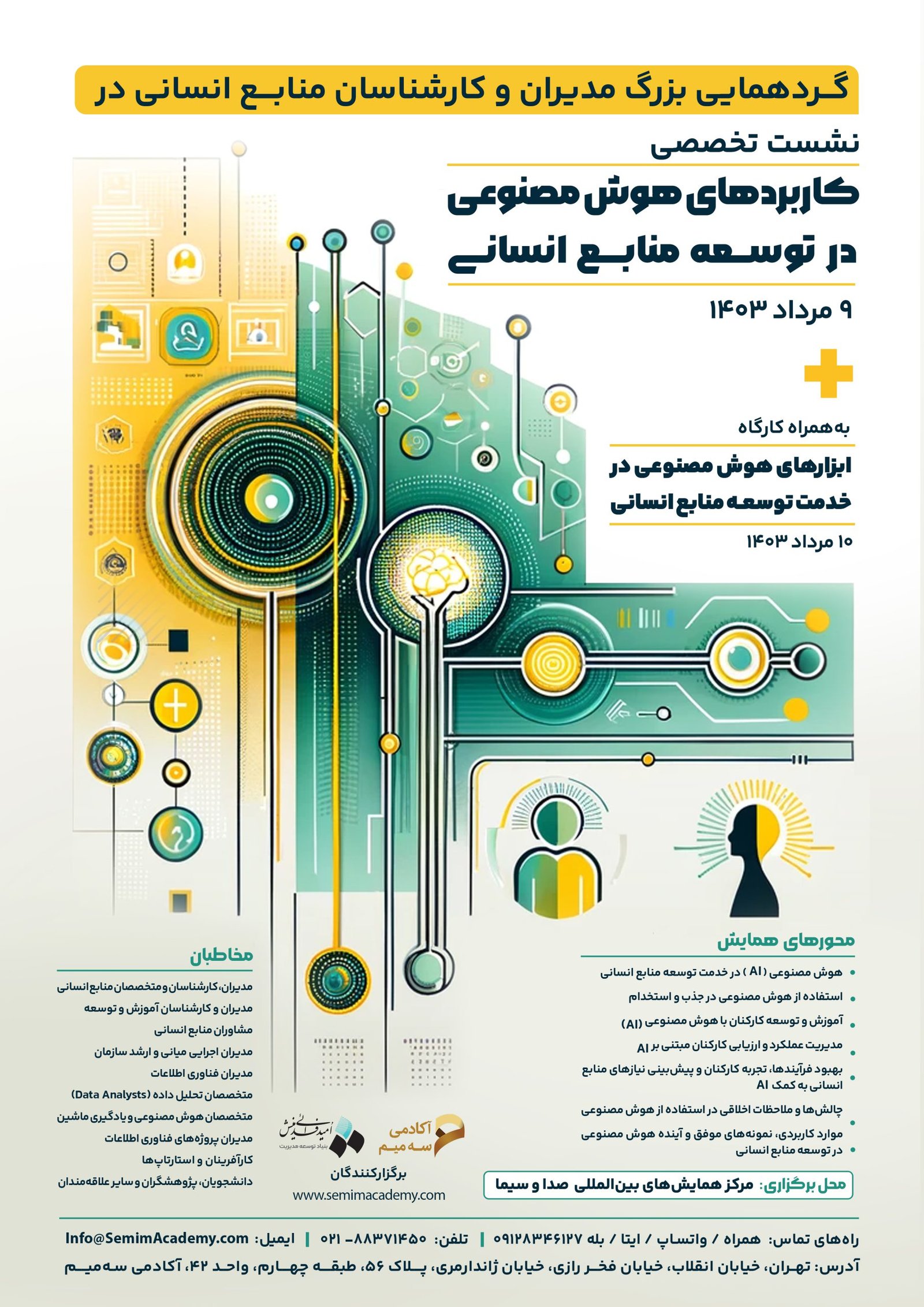در گردهمایی بزرگ مدیران و کارشناسان منابع انسانی در نشست تخصصی کاربردهای هوش مصنوعی در توسعه منابع انسانی که در تاریخ 10 مردادماه 1403 برگزار میگردد، از اساتید برجستهای همچون پرفسور علیاکبر جلالی، دکتر بهزاد ابوالعلایی، دکتر کوروش فتحی واجارگاه و دکتر مهدی شامی زنجانی دعوت گردیده است که در باب محورهای نشست به ارائه نکات مهم علمی و عملی بصورت مختصر و مفید سخنرانی نمایند.